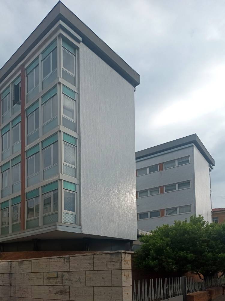 I corpi circolari del basamento in mattoni rimandano alle rotondità della vicina Rocca Costanza, e creano un invito per l’ingresso che è completato da una bella pensilina aggettante sorretta da due pilastri in acciaio su disegno, gemelli degli appoggi in acciaio che costituiscono lo “stacco” con il corpo dei volumi superiori.